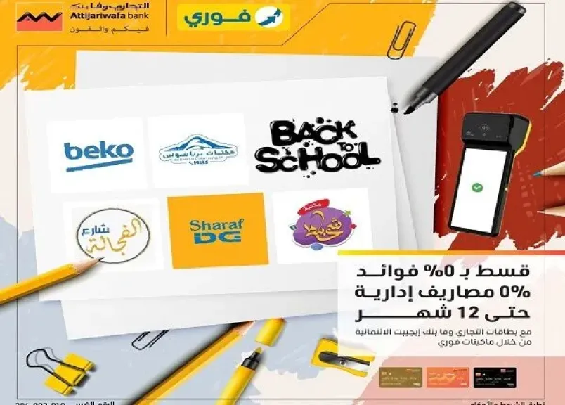 ويتيح التجاري وفا بنك إيجيبت للعملاء إمكانية تقسيط المستلزمات الدراسية، حتى 12 شهراً بدون فوائد أو مصاريف إدارية، وذلك عند الدفع باستخدام بطاقات التجاري وفا بنك إيجيبت الائتمانية من خلال ماكينات فوري حتى 30 سبتمبر 2025.