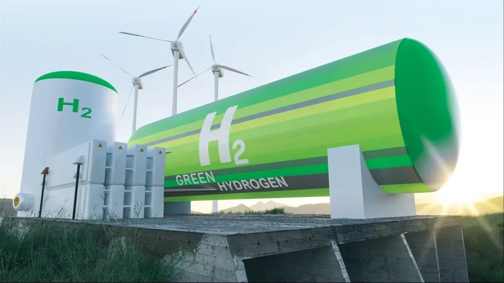 الهيدروجين الأخضر: يُنتَج باستخدام الطاقة المتجددة مثل الشمس والرياح عبر التحليل الكهربائي للماء، وهو محايد مناخيًا ويسهم في الوصول لصافي الانبعاثات الصفرية.