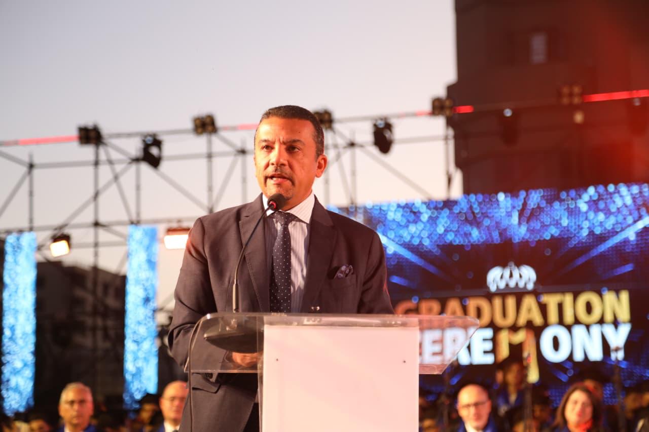 من جانبه، أكد الدكتور أيمن عاشور سعادته بالمشاركة في هذه الاحتفالية المتميزة، موجهًا التهنئة للخريجين وأولياء أمورهم الذين كان لهم الدور الأكبر في دعم أبنائهم حتى بلوغ هذه المرحلة المهمة، معربًا عن فخره بانتمائه لكلية الهندسة بجامعة عين شمس، داعيًا الخريجين إلى الاعتزاز بهذا الصرح العريق الذي قدم لمصر والوطن العربي العديد من الشخصيات البارزة التي شغلت مناصب وزارية، وأسهمت في مسيرة التنمية، موضحًا أن الكلية خرجت 22 مهندسًا تقلدوا منصب وزير، واثنين من رؤساء الوزراء، إلى جانب نماذج ناجحة مثل المهندس هاني عازر، مشيرًا إلى الفترة التي تولى خلالها عمادة الكلية، والتي يعتز بها، حيث شهدت وضع مسودة الإستراتيجية الوطنية للتعليم العالي والبحث العلمي التي تم إعلانها عام 2023.