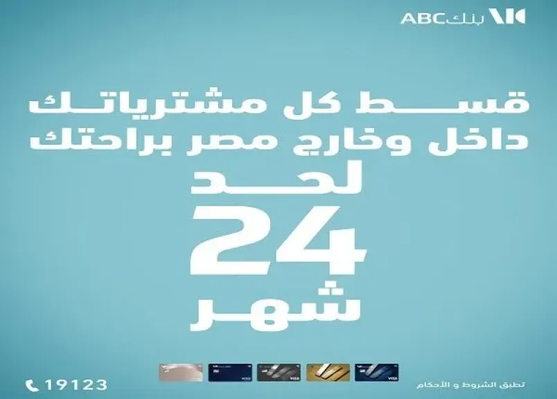 أعلن بنك ABC مصر، عبر صفحته الرسمية على موقع التواصل الاجتماعي Facebook عن أحدث عروضه للعملاء، إذ يتيح فرصة تقسيط المشتريات داخل وخارج مصر حتى 24 شهراً.