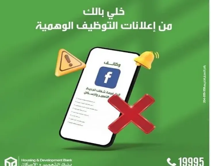 حذر بنك التعمير والإسكان من إعلانات الوظائف الوهمية عبر المواقع الإلكترونية، وذلك لحماية الباحثين عن عمل من عمليات الاحتيال.