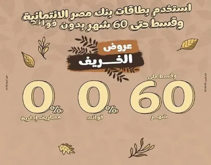 ويتيح بنك مصر بخصومات وعروض الخريف للعملاء حاملي بطاقات بنك مصر الائتمانية، حيث يمكنهم تقسيط المشتريات حتى 60 شهراً بدون فوائد وبدون مصاريف إدارية، بالإضافة إلى العروض المميزة لحاملي بطاقات الخصم المباشر.