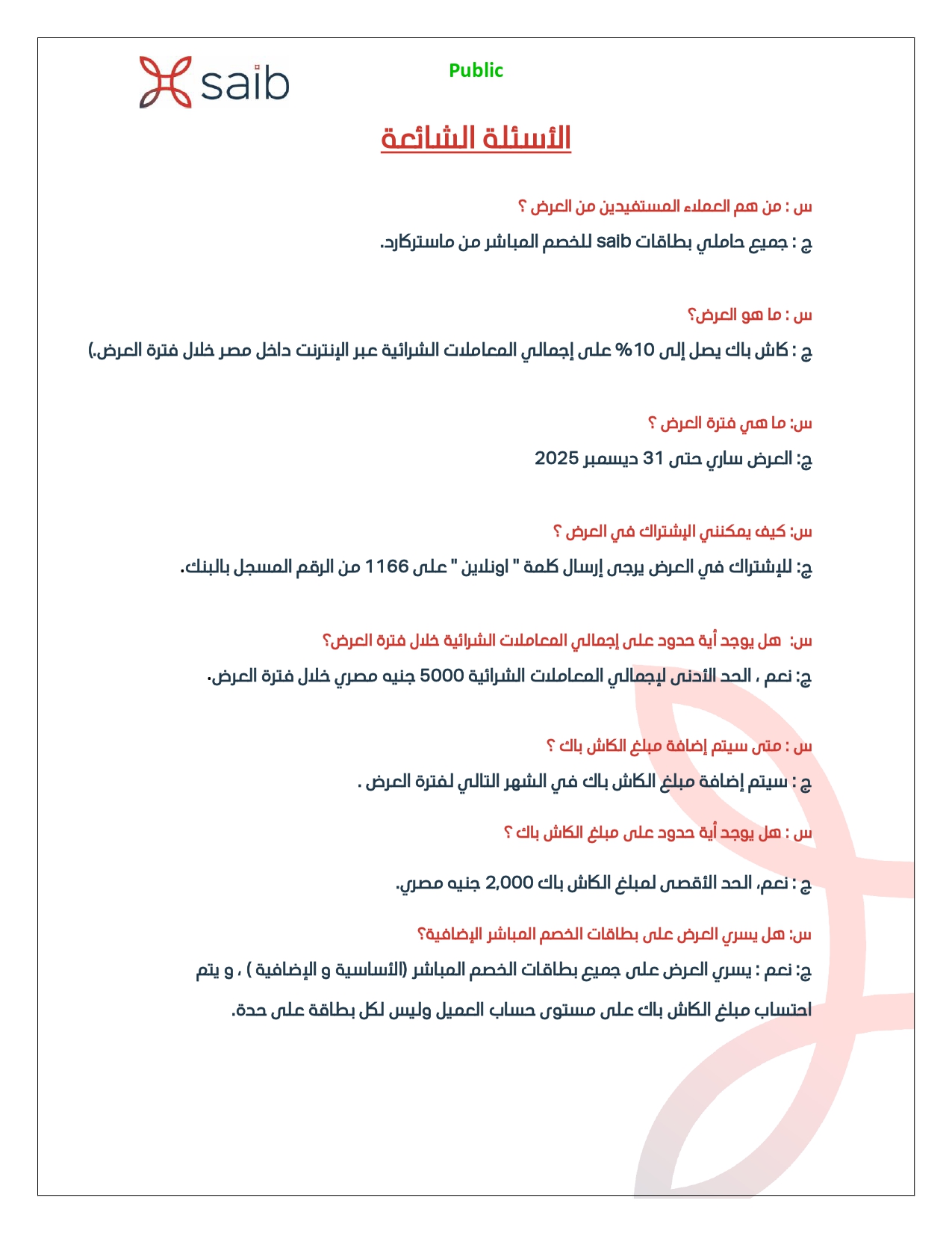 ويتيح البنك للعملاء فرصة الحصول على كاش باك يصل إلى 10% من قيمة مشتريات الأونلاين المحلية، وذلك عند الدفع ببطاقات بنك saib للخصم المباشر من Mastercard حتى 2025/12/31.