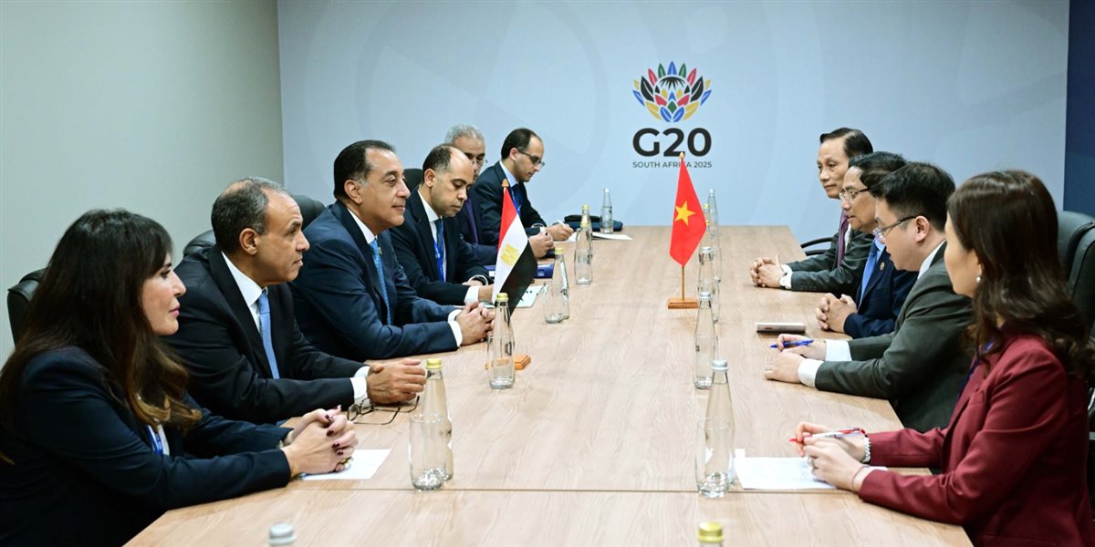 على هامش مشاركته نيابة عن الرئيس عبدالفتاح السيسي، رئيس الجمهورية، في قمة مجموعة العشرين (G20) لعام 2025 بمدينة "جوهانسبرج" في جنوب أفريقيا، التقى الدكتور مصطفى مدبولي، رئيس مجلس الوزراء، اليوم، فام مينه تشين، رئيس وزراء فيتنام، وذلك بحضور الدكتور بدر عبدالعاطي، وزير الخارجية والهجرة وشئون المصريين بالخارج، والسفير أحمد علي شريف، سفير مصر في جنوب أفريقيا.