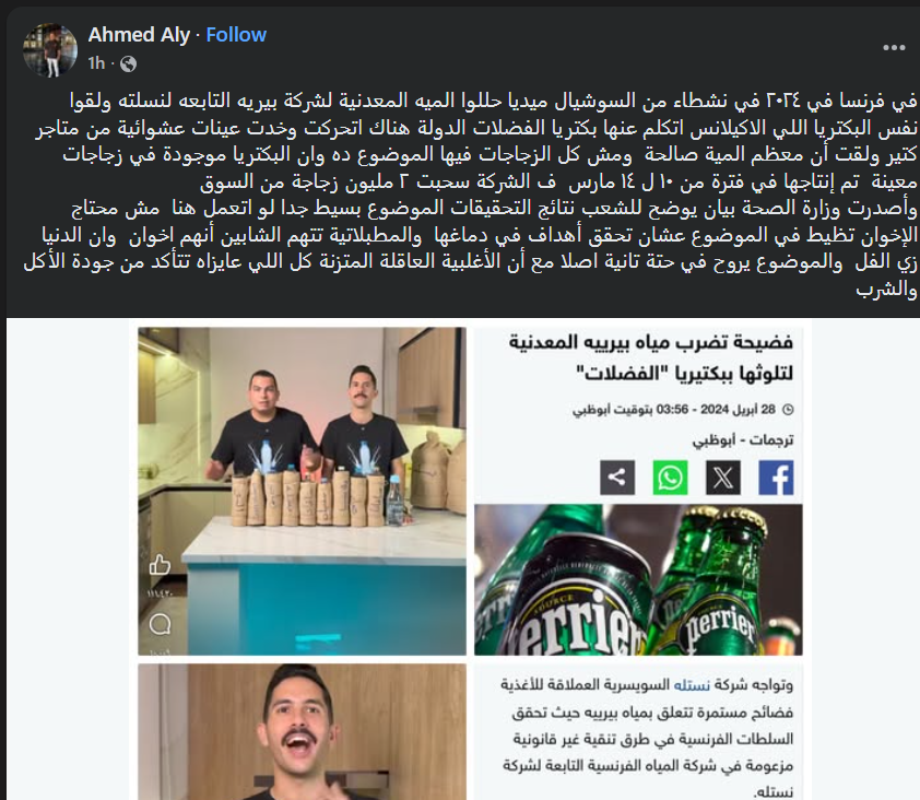 وفي هذا الصدد، أشار رواد السوشيال ميديا إلى واقعة مشابهة حدثت في فرنسا عام 2004، وهي: “في فرنسا في ٢٠٢٤ في نشطاء من السوشيال ميديا حللوا المياه المعدنية لشركة بيريه التابعه لنسلته ولقوا نفس البكتريا اللي الاكيلانس اتكلم عنها بكتيريا الفضلات”.