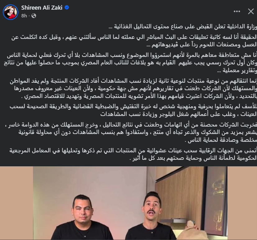 وبمواجهتهما أقرا بإجراء تحليل لبعض المنتجات الغذائية بعدد من المعامل للتأكد من مطابقتها للمواصفات القياسية وتصوير مقاطع الفيديو المشار إليها بمنزل أحدهما، ونشرها على صفحتهما بمواقع التواصل الاجتماعي بغرض زيادة نسب المشاهدات وتحقيق مكاسب مادية، وتم اتخاذ الإجراءات القانونية حيال الواقعة.