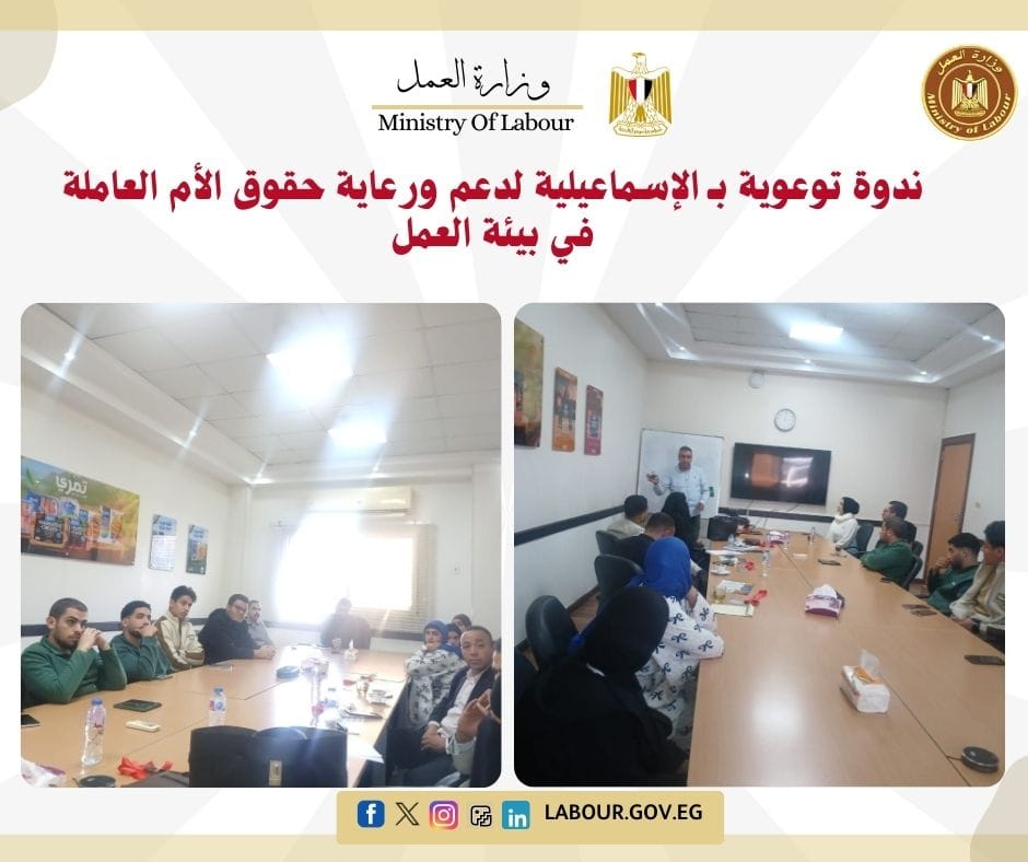 وقامت مديرية العمل بالإسماعيلية، بقيادة الدكتور أيمن شعبان مدير المديرية، بعقد ندوة توعوية للعاملين بشركة الدقهلية للمجازر لدعم ورعاية الأم العاملة وتوفير بيئة عمل ملائمة.