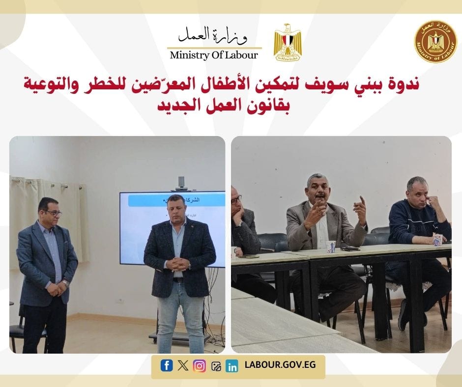 نظمت مديرية العمل ببني سويف، ندوة بعنوان "تمكين الأطفال المعرضين للخطر من الحصول على حقوقهم" بالتعاون مع الهيئة الإنجيلية للخدمات الاجتماعية.