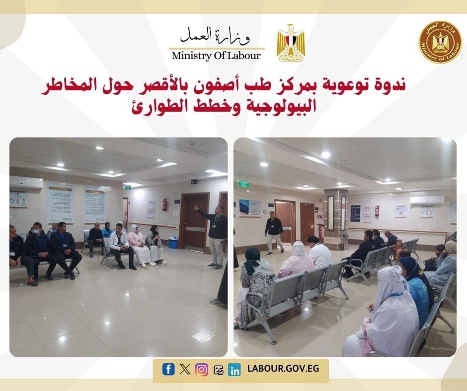 كما نظمت مديرية عمل الأقصر بقيادة محمود باسل محمد مدير المديرية ندوة تثقيفية بعنوان "المخاطر البيولوجية وخطة الطوارئ" بمركز طب أصفون بإسنا.