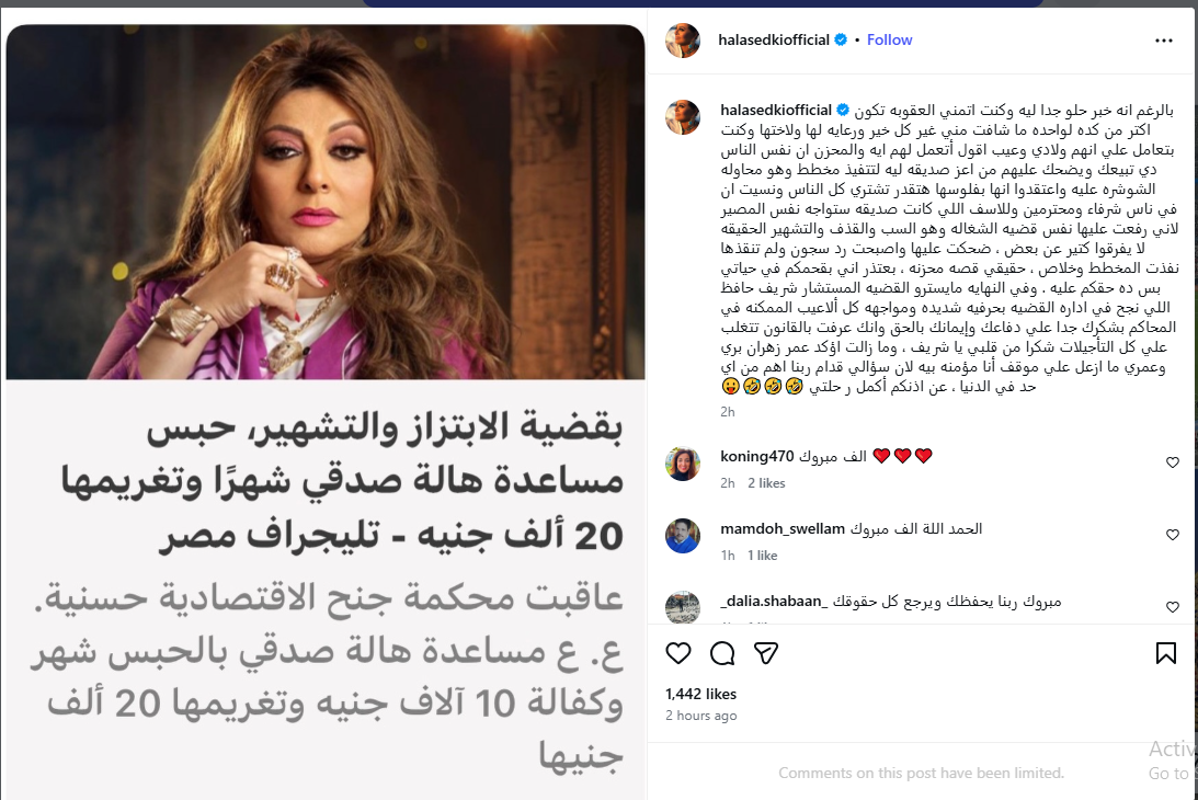 وكتبت صدقي في منشور عبر حسابها على إنستجرام أن الحكم أسعدها كثيرًا، وكانت تتمنى أن تكون العقوبة أكبر، خاصة أنها لم تُقدِّم لمساعدتها ولأختها سوى الخير والدعم، وكانت تعاملهم كأبنائها.