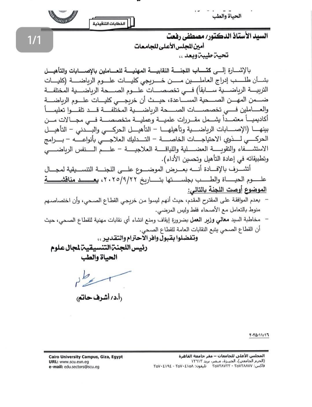 كشف الدكتور سامي سعد، النقيب العام للعلاج الطبيعي، عن صدور قرارا من اللجنة التنسيقية لمجال علوم الحياة والطب بالمجلس الأعلى للجامعات، برئاسة الدكتور أشرف حاتم رئيس لجنة الصحة بمجلس النواب، يقضي برفض طلب "اللجنة النقابية المهنية للعاملين بالإصابات والتأهيل" بشأن إدراج خريجي كليات علوم الرياضة (التربية الرياضية سابقا) ضمن المهن الصحية المساعدة.