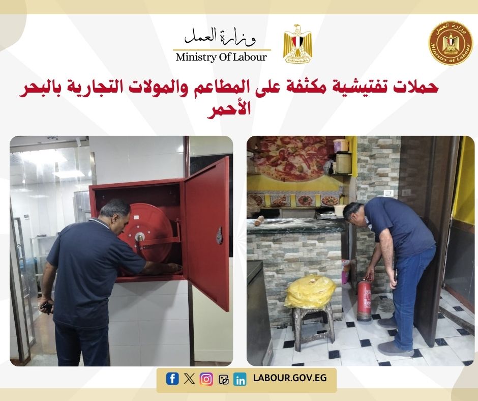 نفذت مكاتب تفتيش العمل والسلامة والصحة المهنية حملات تفتيشية على عدد من المطاعم، وذلك تنفيذاً لتوجيهات وزير العمل محمد جبران بتكثيف حملات التفتيش، وتحت إشراف أحمد جابر عبد الباسط مدير مديرية العمل بالبحر الأحمر.