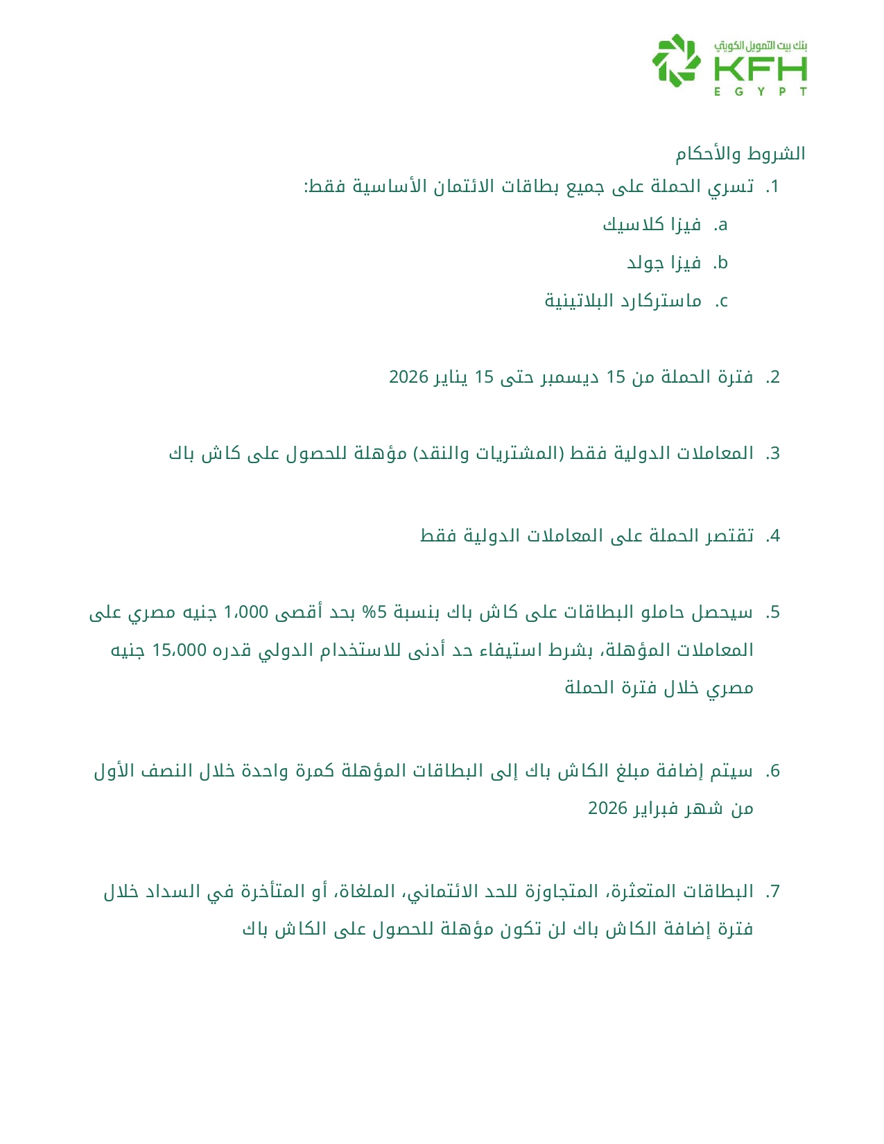 ويتيح بنك KFHEgypt لعملائه 5% كاش باك على المعاملات الدولية عند الدفع ببطاقات بنك بيت التمويل الكويتي مصر الائتمانية.