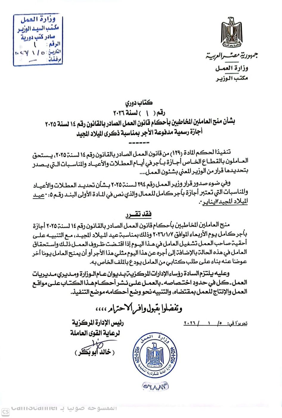 أعلن وزير العمل محمد جبران، اليوم الاثنين، أن يوم الأربعاء المقبل الموافق 7 يناير 2026، إجازة رسمية مدفوعة الأجر، بمناسبة عيد الميلاد المجيد، وذلك للعاملين في شركات القطاع الخاص المخاطبين بأحكام قانون العمل الصادر بالقانون رقم 14 لسنة 2025.