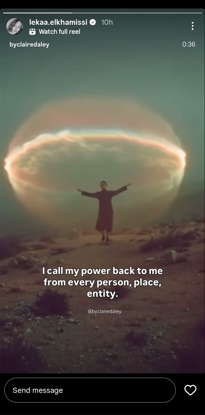 واكتفت الخميسي بإرفاق الفيديو بعبارة تحمل دلالات قوية: "أستعيد قوتي لنفسي من كل شخص ومكان وكيان".