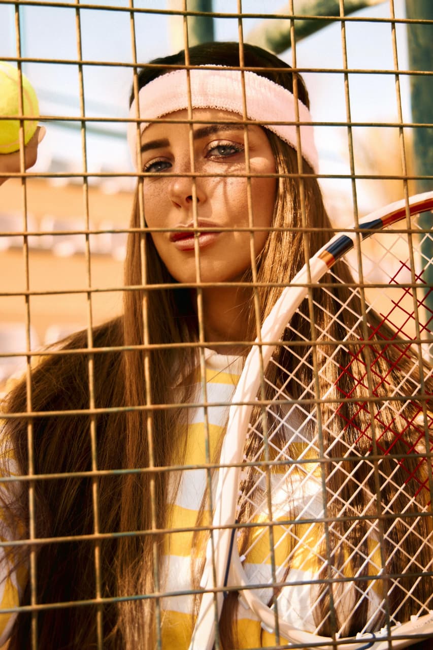 وظهرت ريم مصطفى خلال جلسة التصوير داخل أحد ملاعب التنس، مرتدية أزياء رياضية عصرية جمعت بين العملية والأناقة؛ إذ تنوعت إطلالاتها بين فستان تنس قصير باللونين الأسود والأبيض، مع حذاء رياضي وجوارب طويلة، إلى جانب إطلالة أخرى بكنزة رياضية قصيرة باللون الأخضر الفاتح مع تنورة بيضاء، كما اعتمدت إكسسوارات بسيطة ونظارة شمسية عصرية.