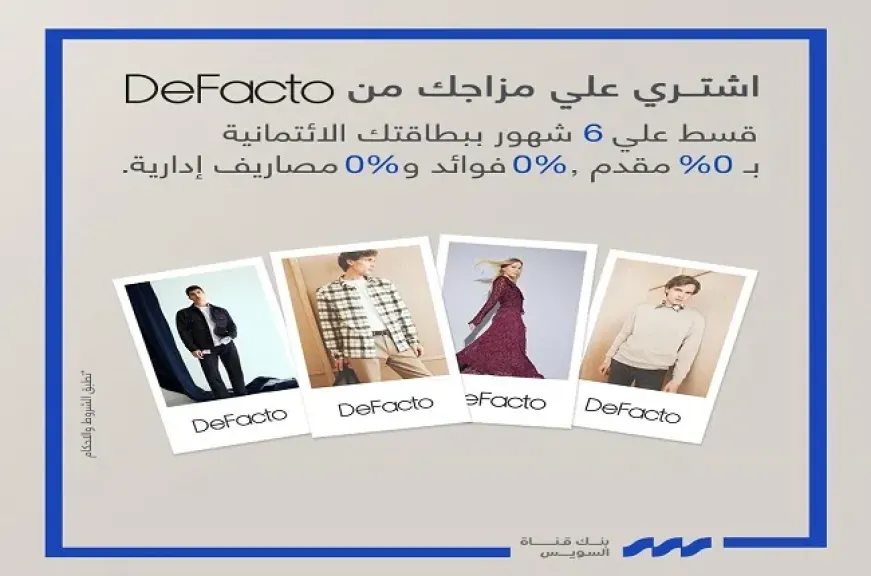 بنك قناة السويس يتيح تقسيط المشتريات من Defacto حتى 6 أشهر بدون فوائد وخصم 10%
