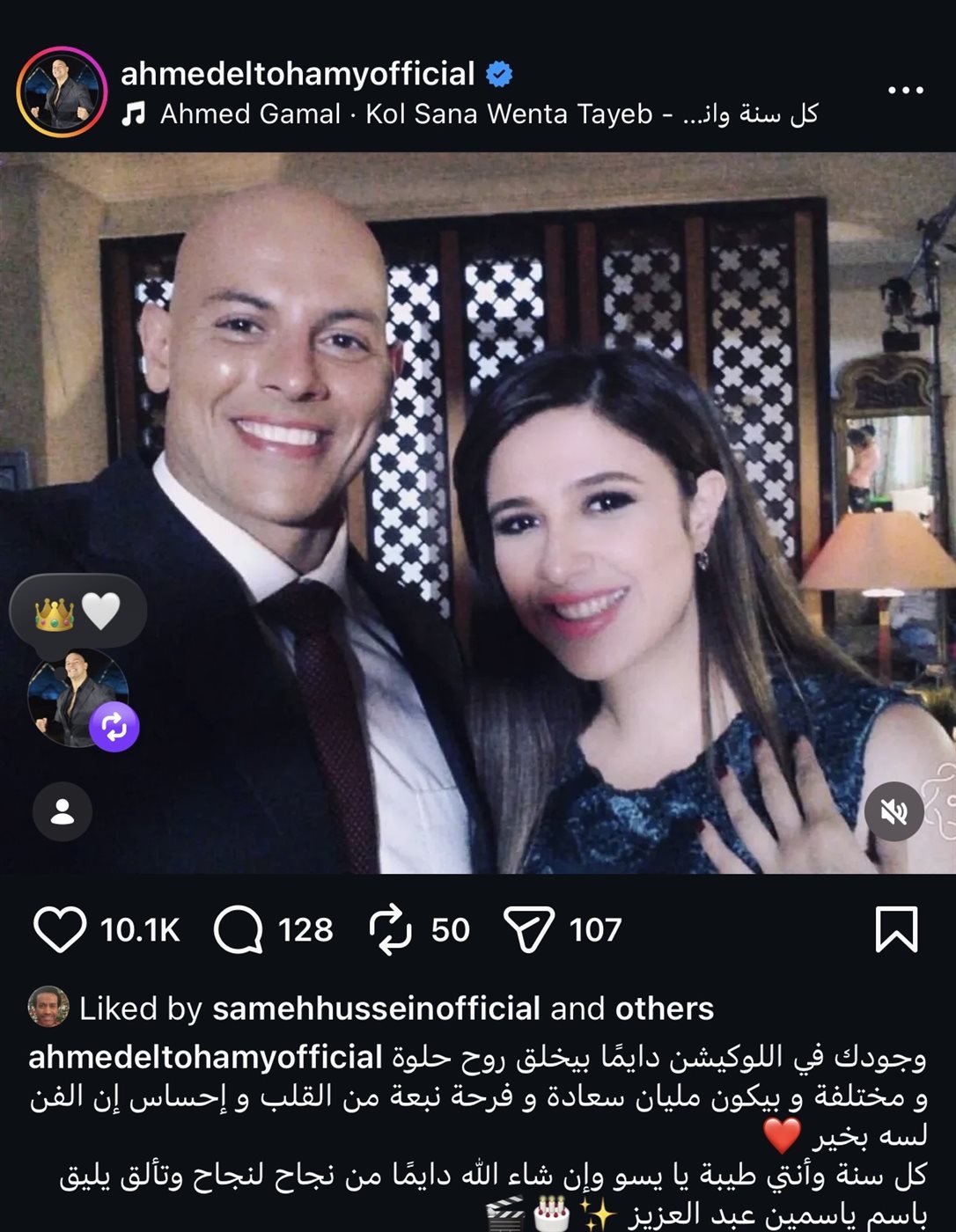 أحمد التهامي يهنئ ياسمين عبد العزيز بعيد ميلادها