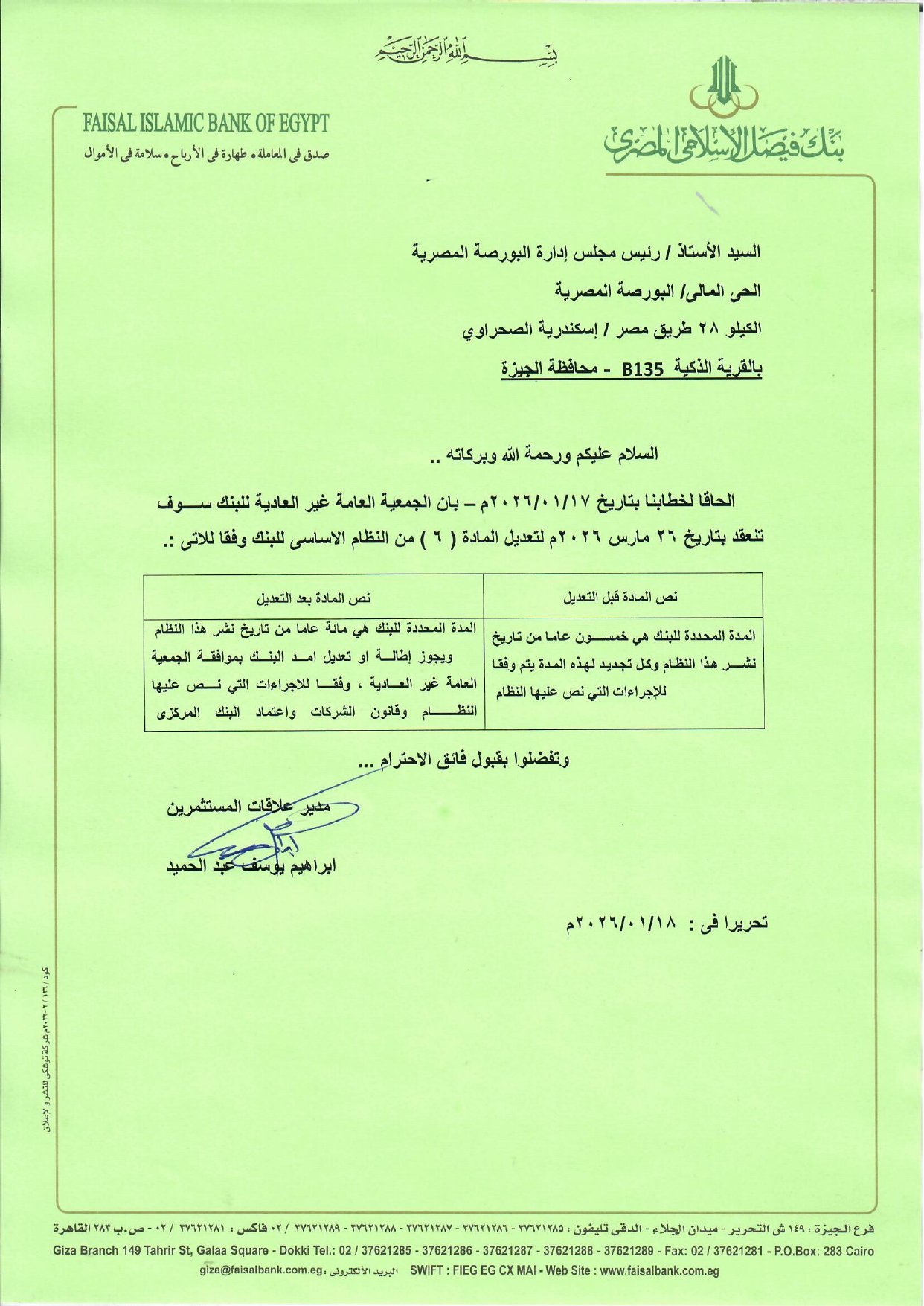 أعلن بنك فيصل الإسلامي المصري أن مجلس إدارته قد انعقد بتاريخ 17 يناير 2026، وقرر دعوة الجمعية العامة غير العادية للانعقاد يوم 26 مارس 2026، وذلك للنظر في تجديد مدة البنك 100 عام جديدة حتى عام بنك فيصل الإسلامي يعتزم تجديد مدة البنك 100 عام حتى 2126.