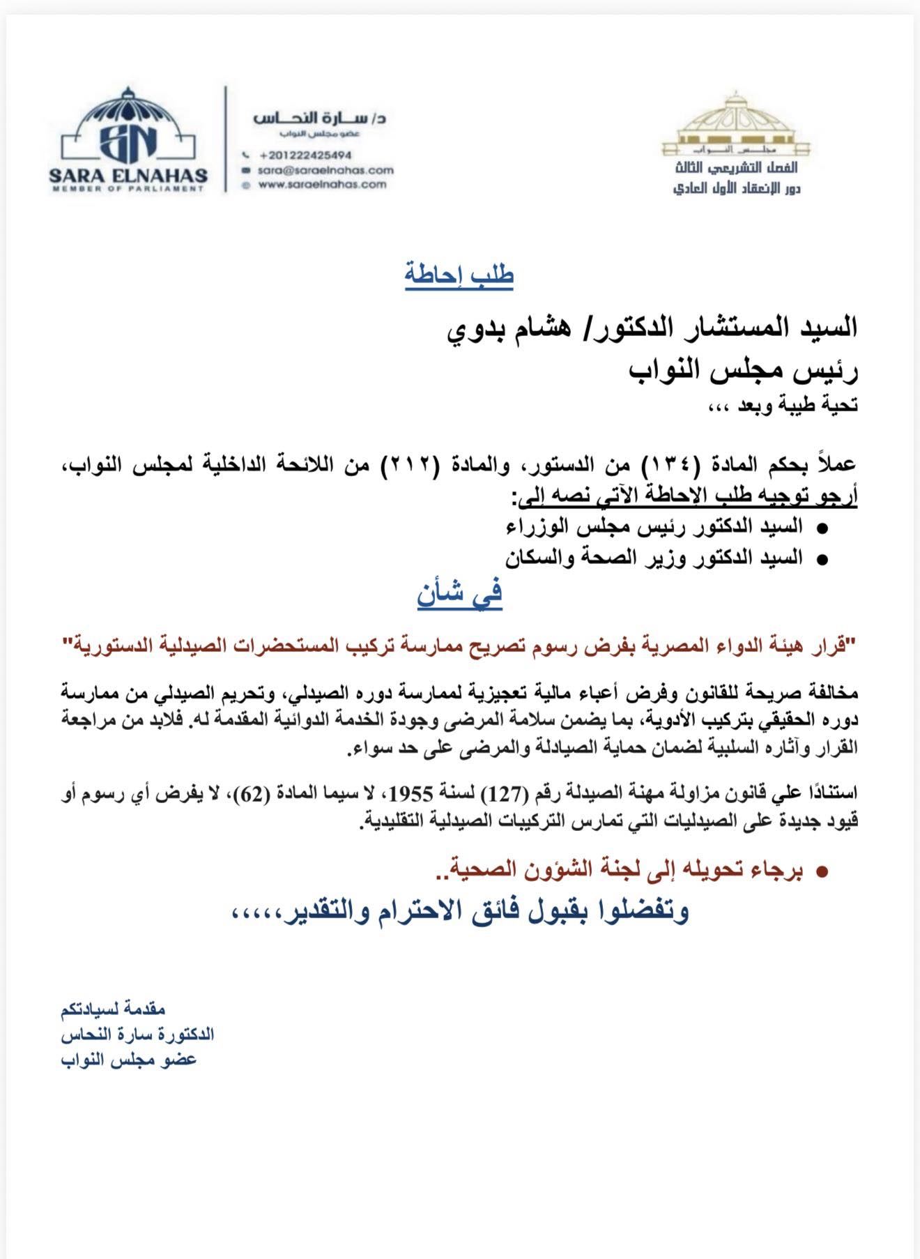 وأشارت عضو مجلس النواب سارة النحاس في طلب الاحاطه انه مخالفة صريحة للقانون وفرض أعباء مالية تعجيزية لممارسة دوره الصيدلي، وتحريم الصيدلي من ممارسة دوره الحقيقي بتركيب الأدوية، بما يضمن سلامة المرضى وجودة الخدمة الدوائية المقدمة له.
