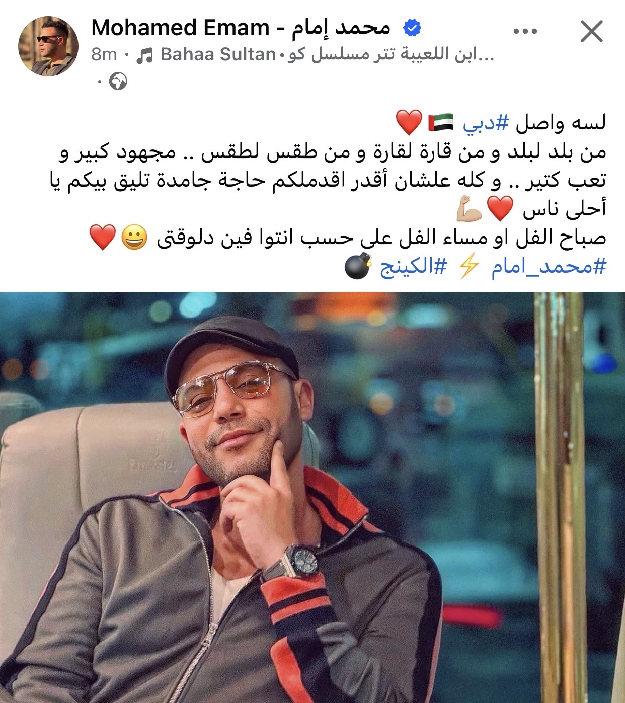 وكتب محمد إمام عبر حسابه الشخصي بموقع التواصل الاجتماعي فيسبوك: "لسه واصل دبي، من بلد لبلد و من قارة لقارة و من طقس لطقس مجهود كبير و تعب كتير و كله علشان أقدر اقدملكم حاجة جامدة تليق بيكم يا أحلى ناس، صباح الفل او مساء الفل على حسب انتوا فين دلوقتى".