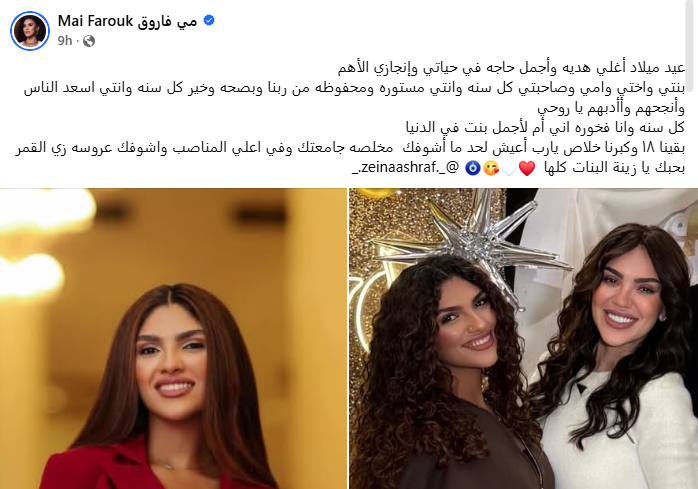 وكتبت مي فاروق عبر حسابها على فيس بوك: «عيد ميلاد أغلى هدية وأجمل حاجة فى حياتى، وإنجازى الأهم.. بنتى وأختى وأمى وصاحبتى. كل سنة وانتى مستورة ومحفوظة من ربنا وبصحة وخير، وكل سنة وانتى أسعد الناس وأنجحهم وأأدبهم يا روحي».