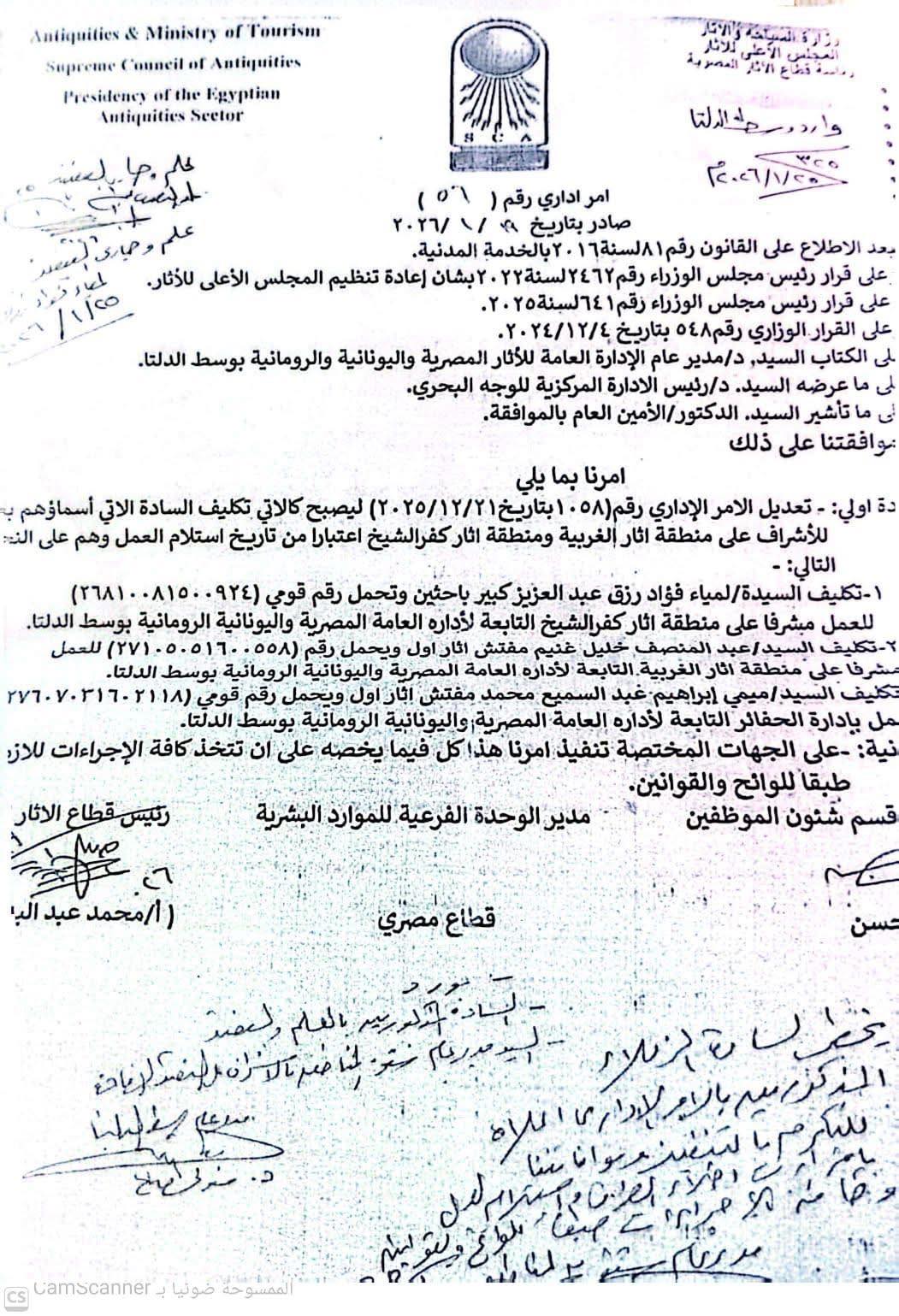 أصدر المجلس الأعلى للآثار، التابع لوزارة السياحة والآثار أمر إدارى رقم 56 لسنة 2026، بتعديل الأمر الإدارى رقم 1058 بتاريخ 12 ديسمبر 2025 الماضي، في إطار التطوير الهيكلي والوظيفي وضخ دماء جديدة بمنطقة آثار كفر الشيخ.