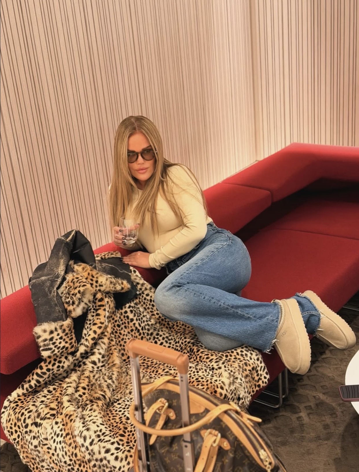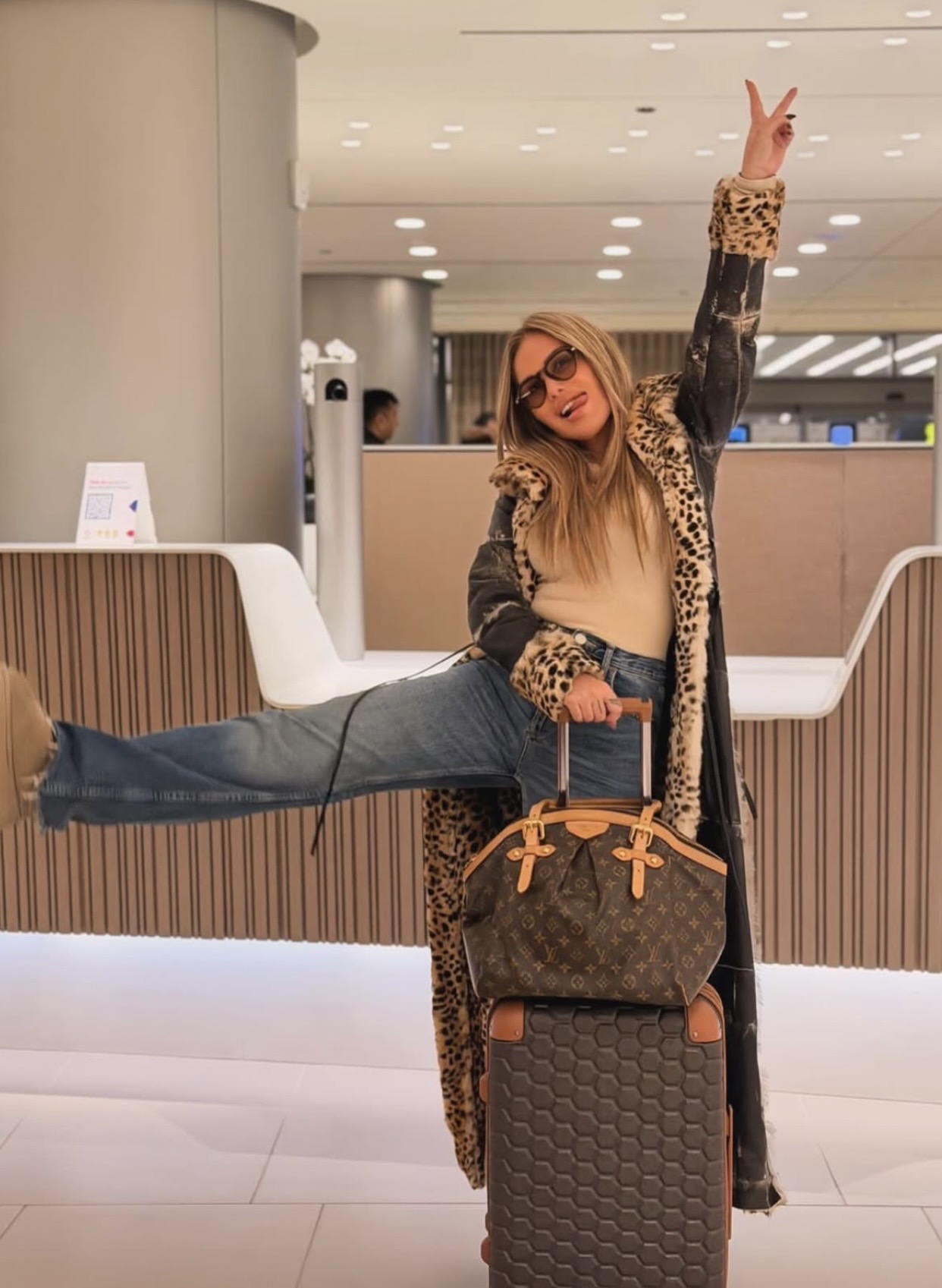 واختارت نيكول معطفًا طويلًا من الجلد مبطنًا بالفرو، ونسقته مع بنطال جينز أزرق واسع وحذاء شتوي مريح باللون البيج، مناسب لأجواء السفر.