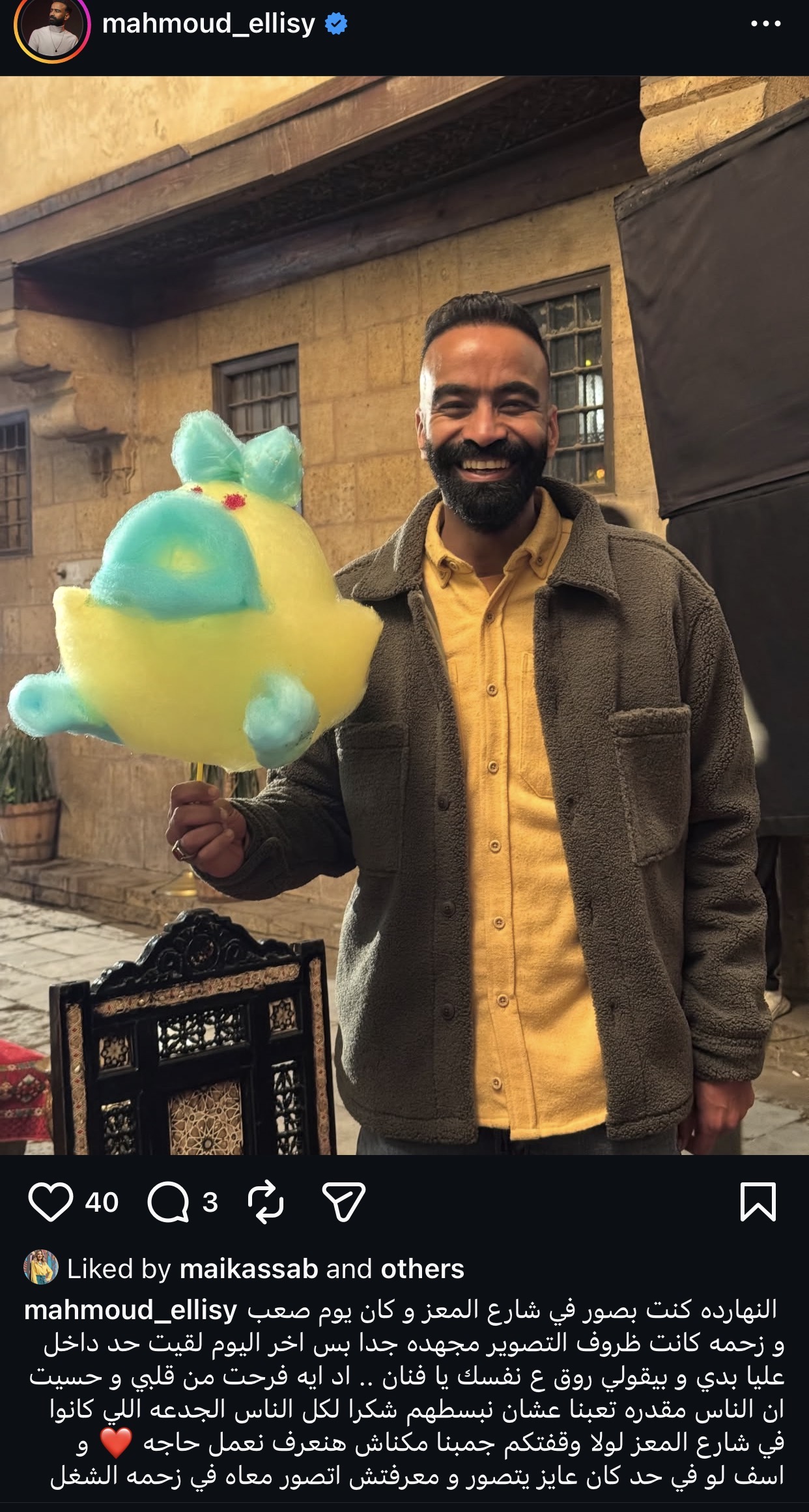 وكتب الليثي عبر حسابه الشخصي بموقع إنستجرام: "النهارده كنت بصور في شارع المعز وكان يوم صعب وزحمه كانت ظروف التصوير مجهده جدا بس اخر اليوم لقيت حد داخل عليا بدي وبيقولي روق ع نفسك يا فنان".