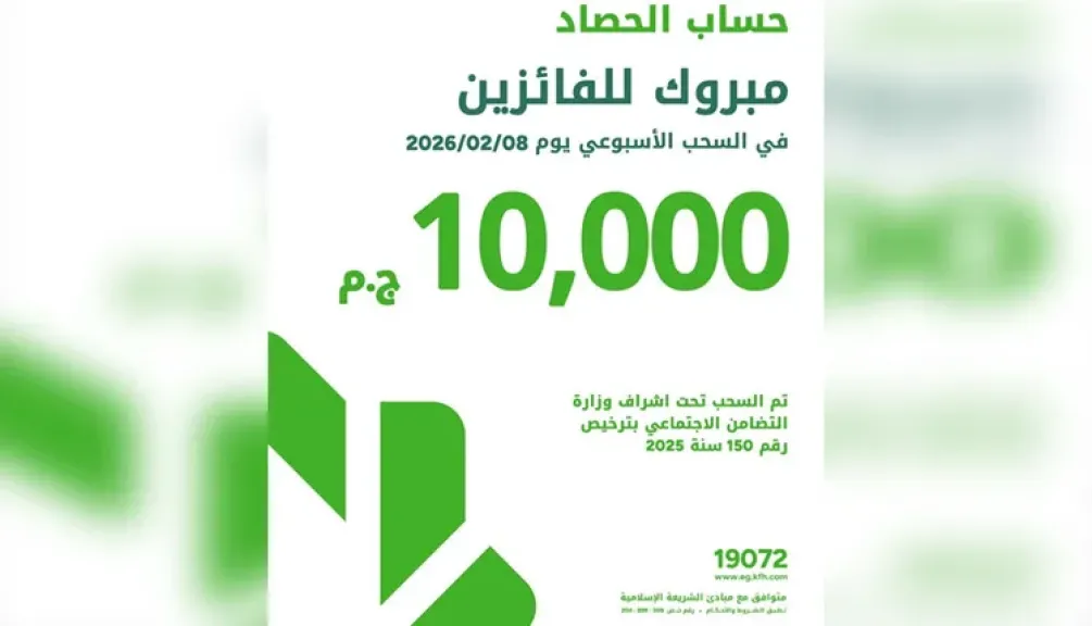 أعلن بنك بيت التمويل الكويتي – مصر عن الفائزين في السحب الأسبوعي لحساب الحصاد، والذي أُجري يوم 8-2-2026، وأسفر عن فوز عدد من العملاء بجوائز نقدية بقيمة 10,000 جنيه لكل فائز.