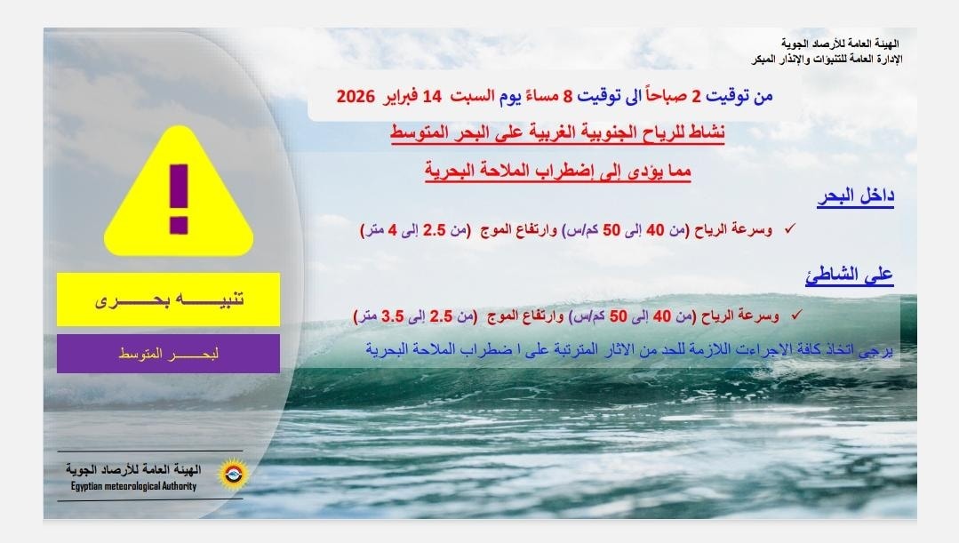 الأرصاد تحذر: أتربة عالقة واضطراب شديد في ملاحة ”المتوسط” اليوم