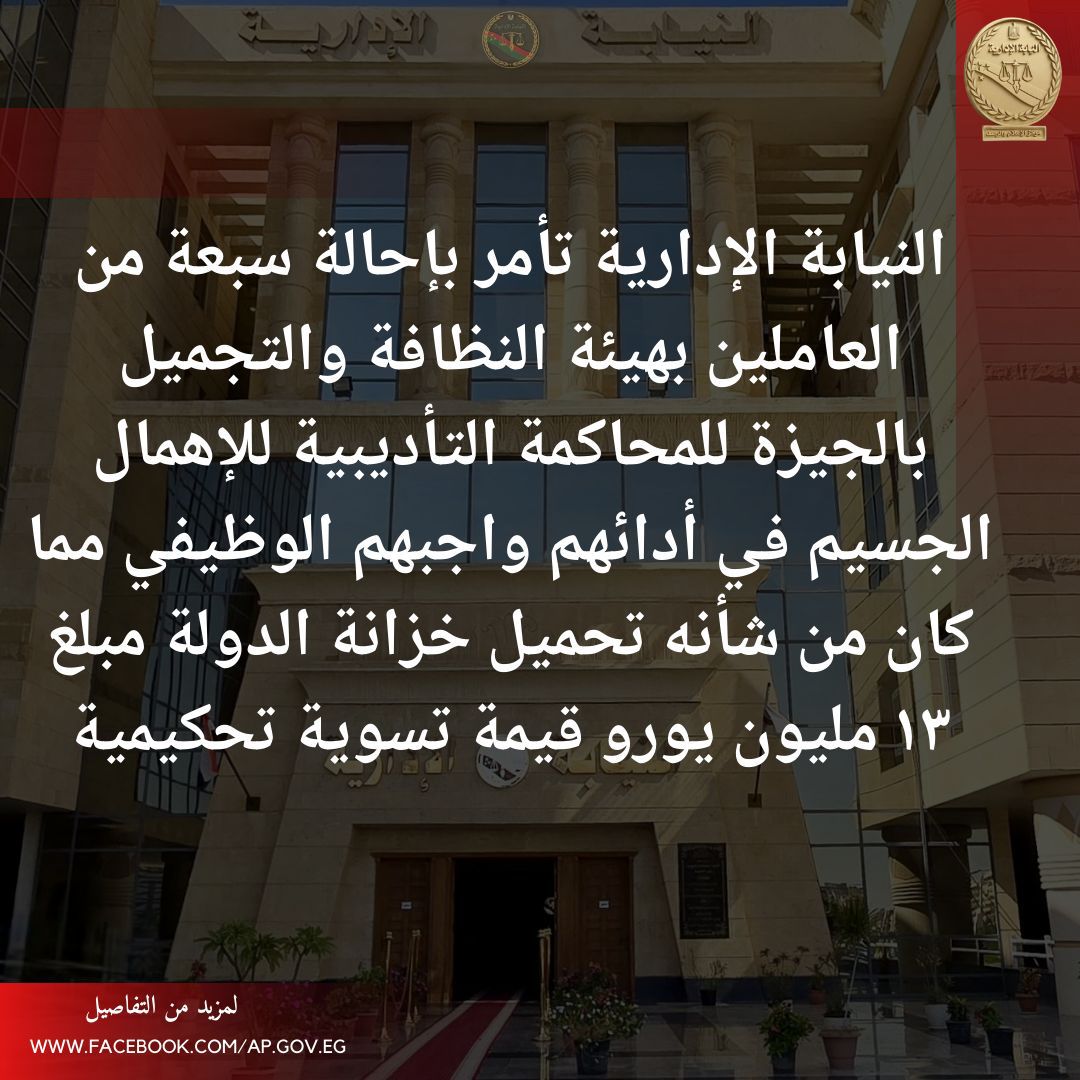 أمر المستشار محمد الشناوي رئيس هيئة النيابة الإدارية، بإحالة 7 من العاملين بالهيئة العامة للنظافة والتجميل بمحافظة الجيزة للمحاكمة التأديبية؛ وذلك على خلفية إهمالهم الجسيم في واجبات وظيفتهم وارتكابهم عددًا من المخالفات المالية والإدارية بأحد المشروعات الكبرى التي تباشرها الهيئة بالشراكة مع إحدى الشركات الأجنبية؛ مما كان من شأنه إضعاف المركز القانوني للدولة وتكبدها أعباءً ماليةً جسيمة قدرت بـ13 مليون يورو لصالح الشريك الأجنبي نظير التسوية التحكيمية المتعلقة بالأضرار المالية لهذا الشريك من جراء المخالفات التي شابت إجراءات التعاقد وتنفيذه.