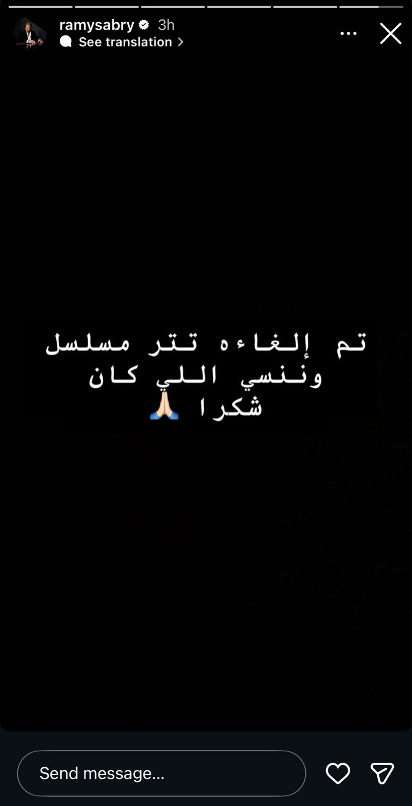 وكتب رامي صبري عبر ستوري حسابه على انستجرام: “تم إلغاء تتر مسلسل وننسى اللي كان”.