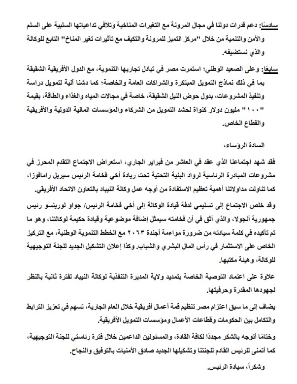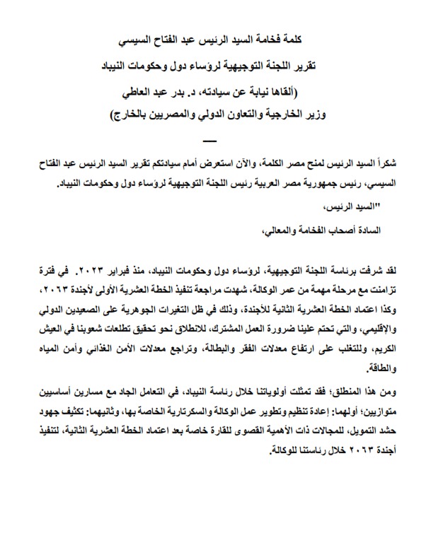 ألقى د. بدر عبد العاطي، وزير الخارجية والتعاون الدولي والمصريين بالخارج، كلمة الرئيس عبد الفتاح السيسي خلال عرض تقرير اللجنة التوجيهية لرؤساء دول وحكومات وكالة الاتحاد الإفريقي للتنمية "النيباد"، أمام القمة الإفريقية.