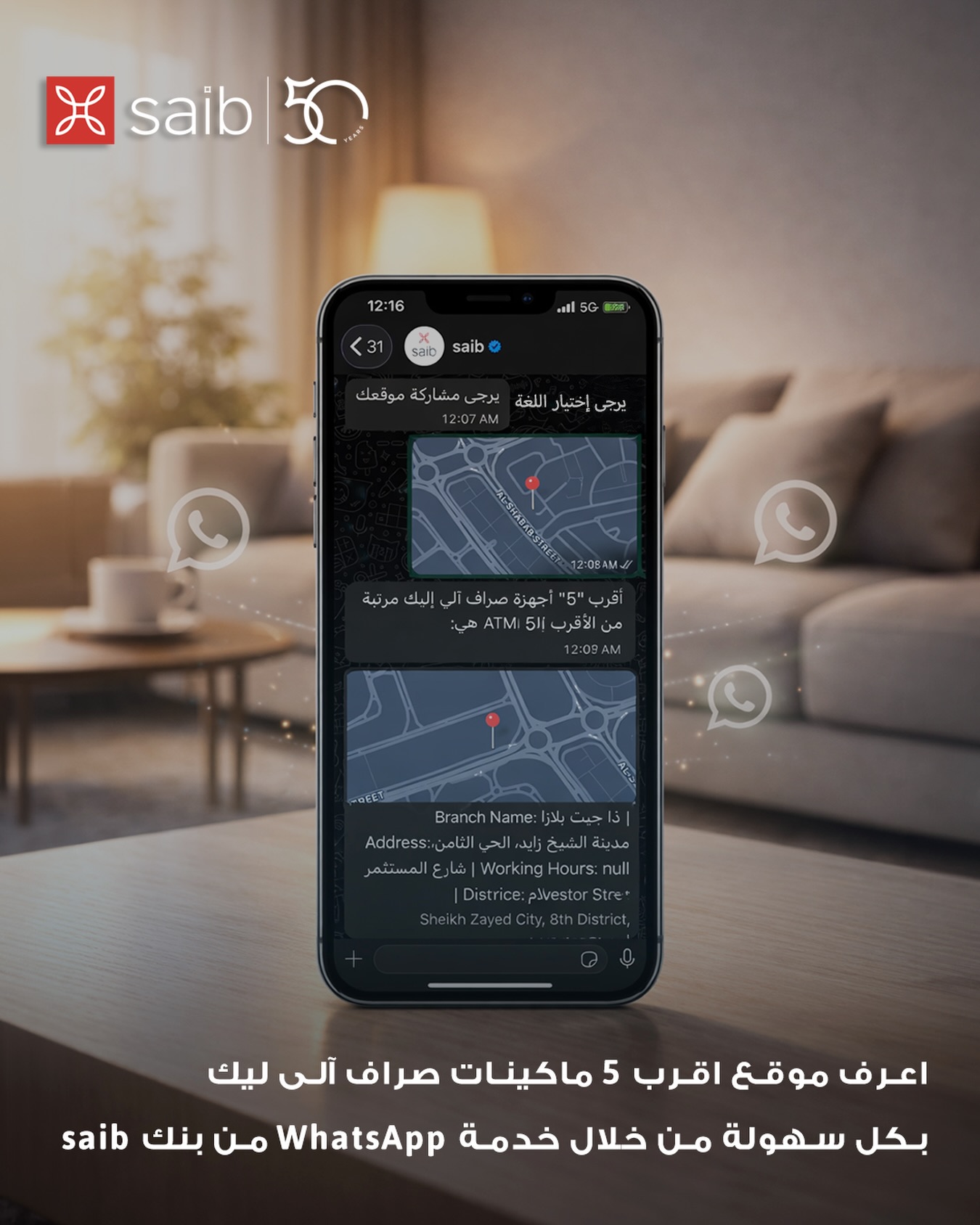 بنك saib يتيح الاستفسار عن الفروع والخدمات عبر WhatsApp Business