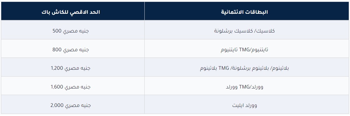 – يتم تحديد حد الكاش باك للبطاقات الائتمانية وبطاقات الخصم المباشر بناءً على نوع البطاقة، كما هو موضح في الجداول أدناه: