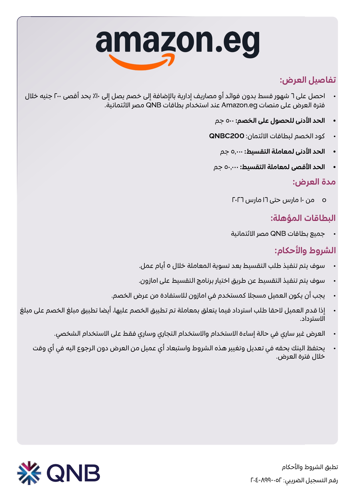 كما يتيح العرض للعملاء الحصول على خصم يصل إلى 10% عند التسوق عبر منصات Amazon الإلكترونية، وذلك عند الدفع باستخدام بطاقات QNB الائتمانية.