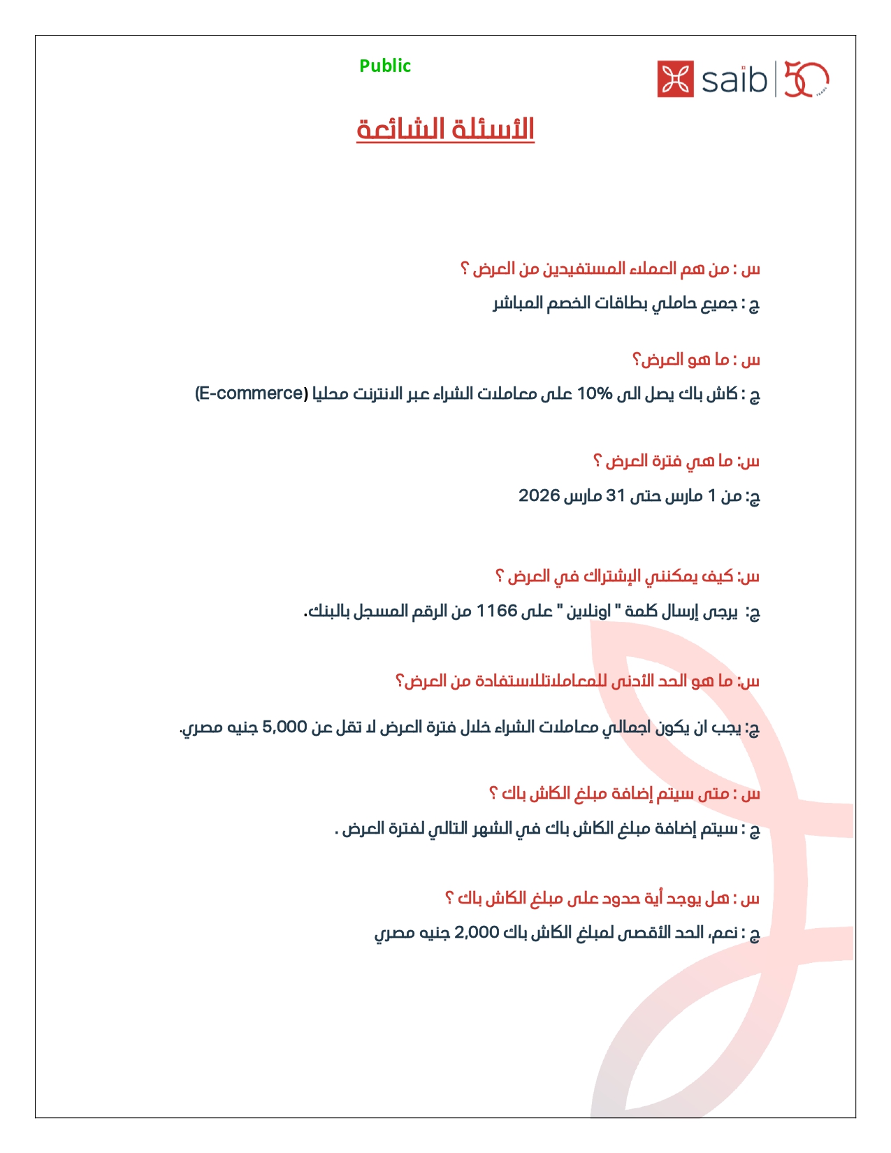أطلق بنك saib عرضًا ترويجيًا جديدًا يتيح لحاملي بطاقات الخصم المباشر فرصة الاستمتاع بكاش باك 10% على مشترياتهم أونلاين.