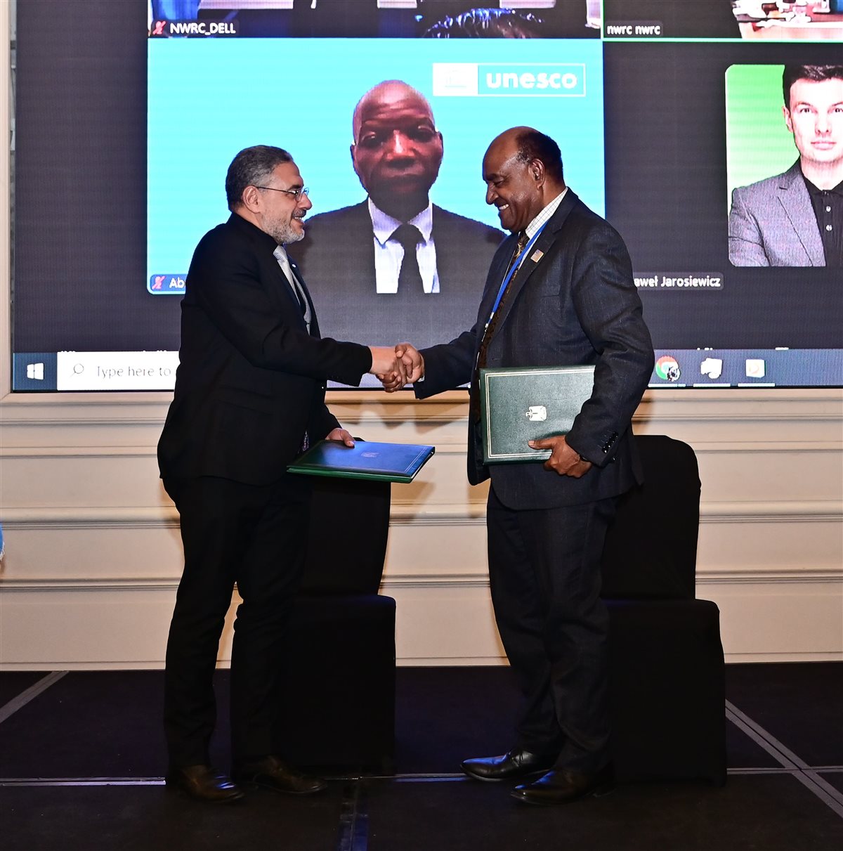 وشهد الوزراء مراسم توقيع "إتفاقية كرسى اليونسكو لإدارة وحوكمة المياه العابرة للحدود بالمركز القومى لبحوث المياه" والتي قام بتوقيعها كل من روبرتو بورا المدير الإقليمى لمكتب اليونسكو القاهرة، و الدكتور شريف محمدي رئيس المركز القومي لبحوث المياه .