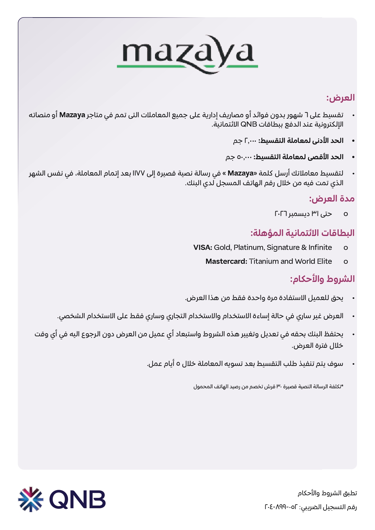 ويمكن للعملاء الاستفادة من العرض عند استخدام بطاقات QNB الائتمانية في عمليات الشراء داخل فروع MAZAYA أو عبر الإنترنت، حيث يتم تقسيط قيمة المعاملة على 6 أشهر دون أي فوائد أو رسوم إدارية.