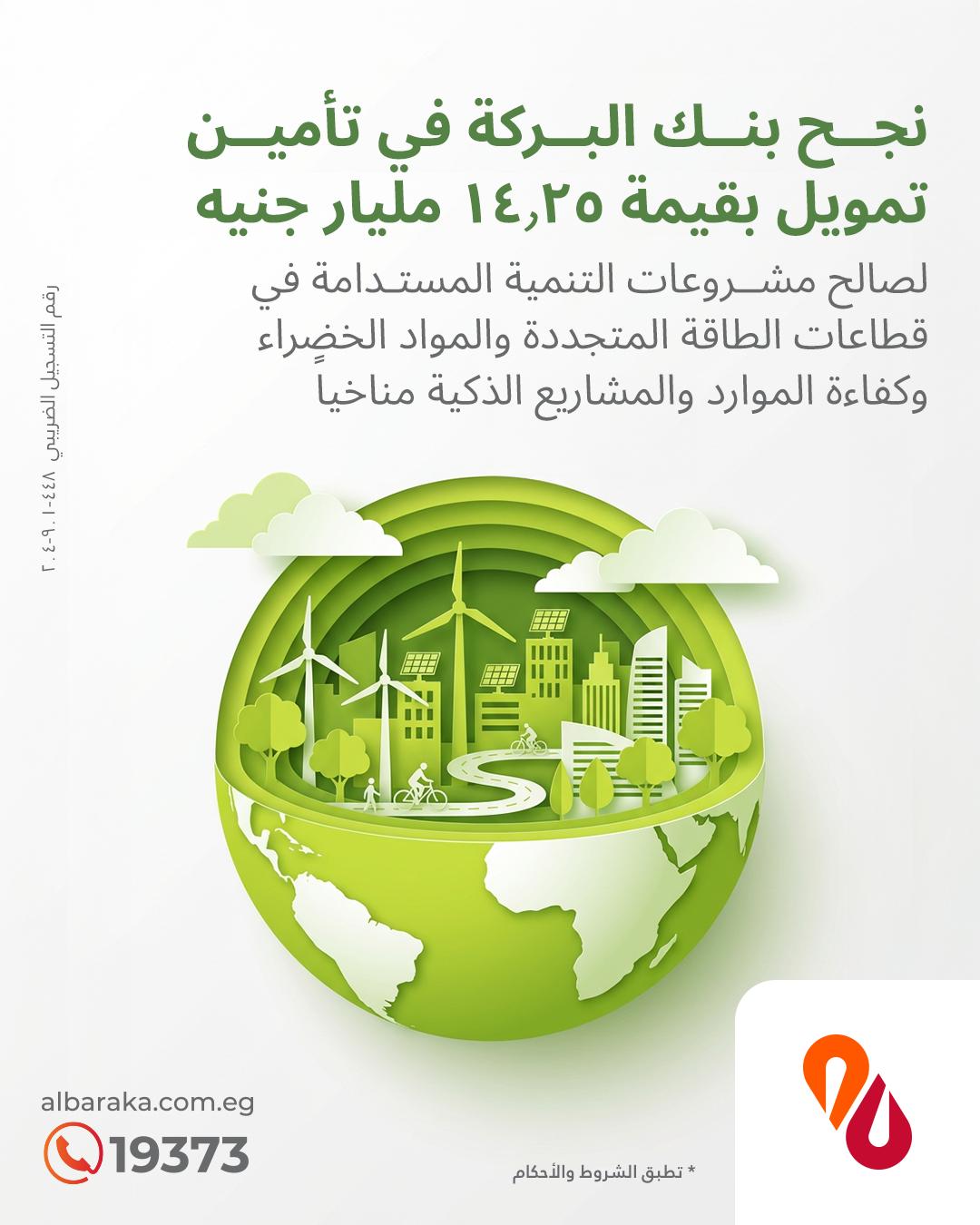 وكشف بنك البركة أنه نجح في تأمين تمويل بقيمة 14.25 مليار جنيه لصالح مشروعات التنمية المستدامة في قطاعات الطاقة المتجددة والمواد الخضراء وكفاءة الموارد والمشاريع الذكية مناخياً.