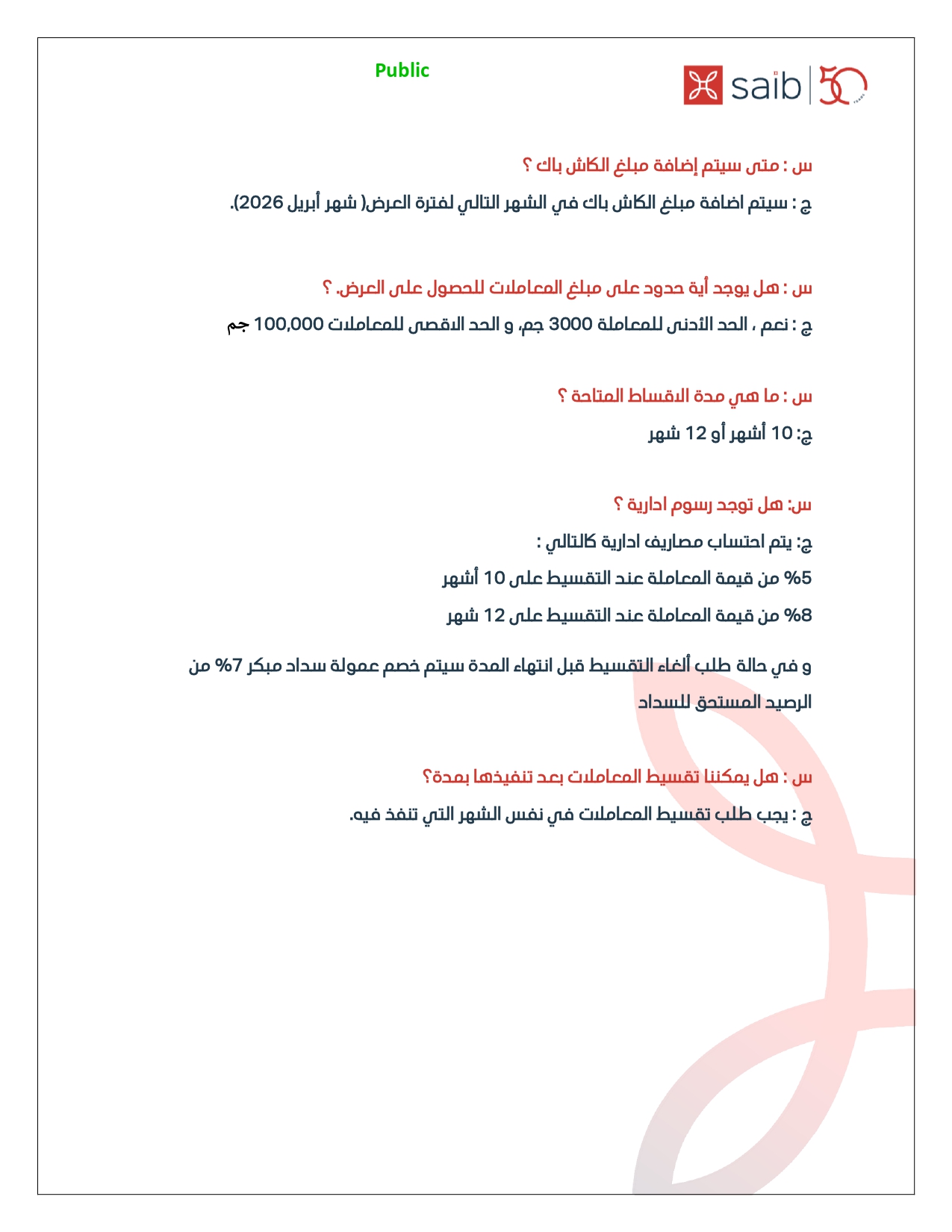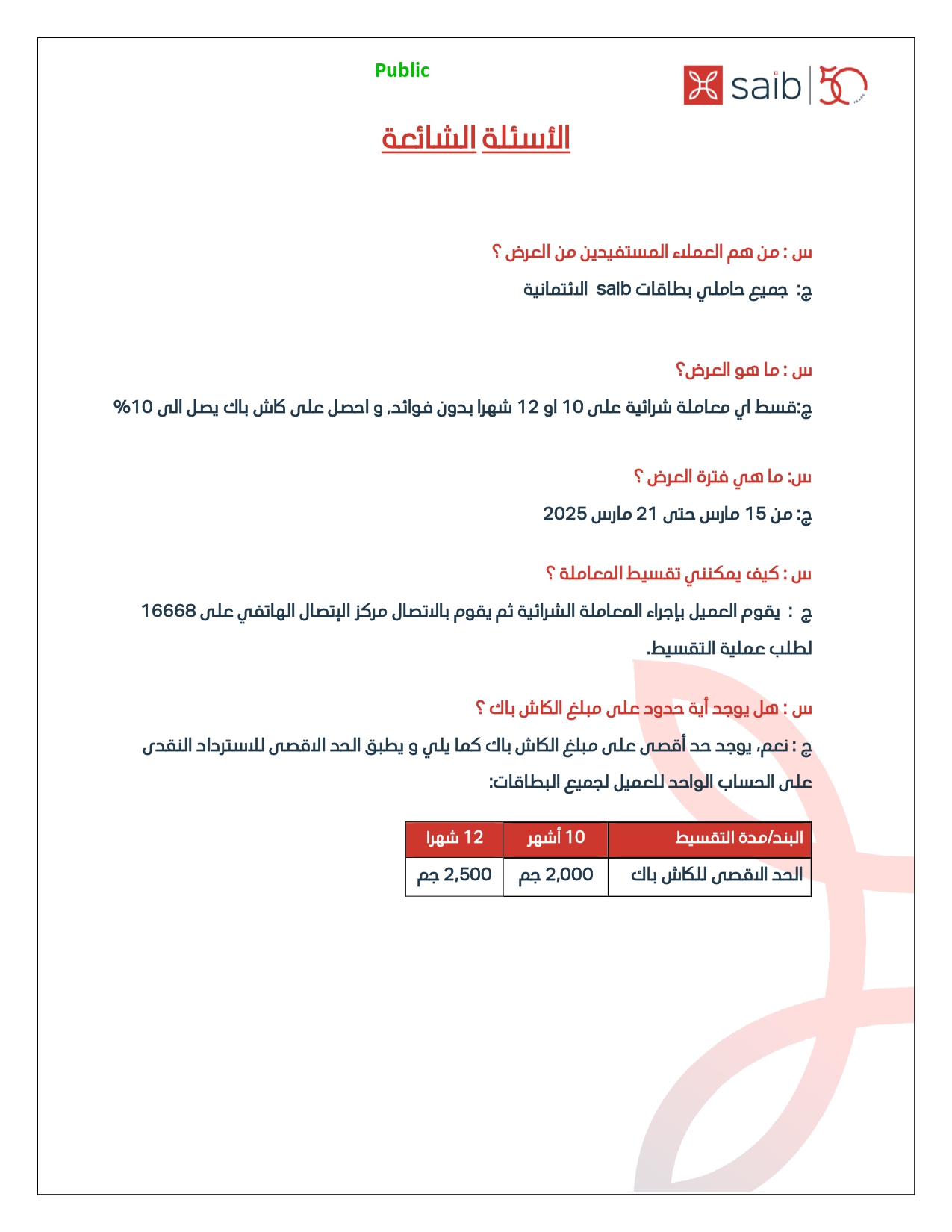 كما يتيح البنك للعملاء أيضًا الاستفادة من كاش باك يصل إلى 10% على المشتريات عند استخدام بطاقات saib الائتمانية من Mastercard، لتسترد جزءًا من قيمة مشترياتك بكل سهولة.