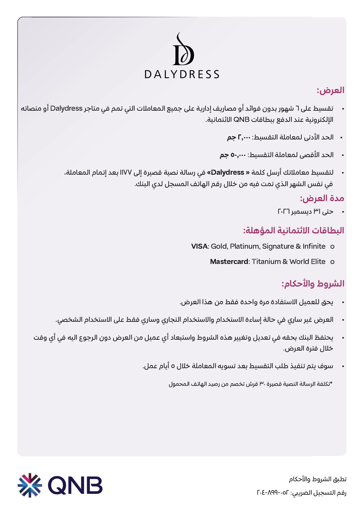 ويتيح البنك للعملاء فرصة شراء ملابس العيد من متاجر DalyDress بالتقسيط حتى 6 أشهر بدون فوائد وذلك عند الدفع ببطاقات QNB مصر الائتمانية.