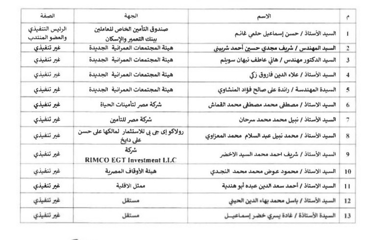 وأعلن بنك التعمير والإسكان عن موافقة الجمعية العامة العادية للبنك المنعقدة بتاريخ 2026/03/18 ، على انتخاب أعضاء مجلس الإدارة لمدة 3 سنوات جديدة، اعتبارًا من مارس 2026 حتى مارس 2029 في ضوء ما أسفرت عنه نتائج التصويت الالكتروني التراكمي وموافقة البنك المركزي المصري على أن يكون تشكيل مجلس الإدارة على النحو التالي: