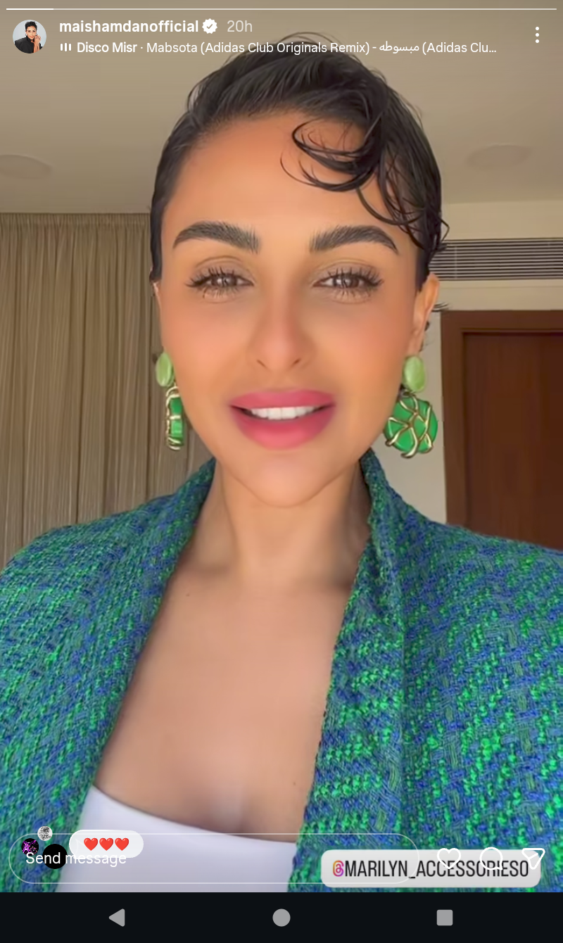 وظهرت ميس حمدان في الصور بإطلالة كاجول، مرتدية جاكت جلد باللون الاخضر، ونالت الصور إعجاب متابعهيا وتفاعلوا معاها بوضع القلوب الحمراء.