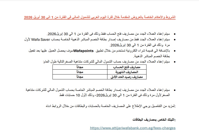 أعلن التجاري وفا بنك إيجيبت، عن تقديم باقة مميزة من العروض والخدمات المجانية للعملاء بمناسبة اليوم العربي للشمول المالي برعاية البنك المركزي المصري خلال الفترة من 1 إلى 30 أبريل 2026.