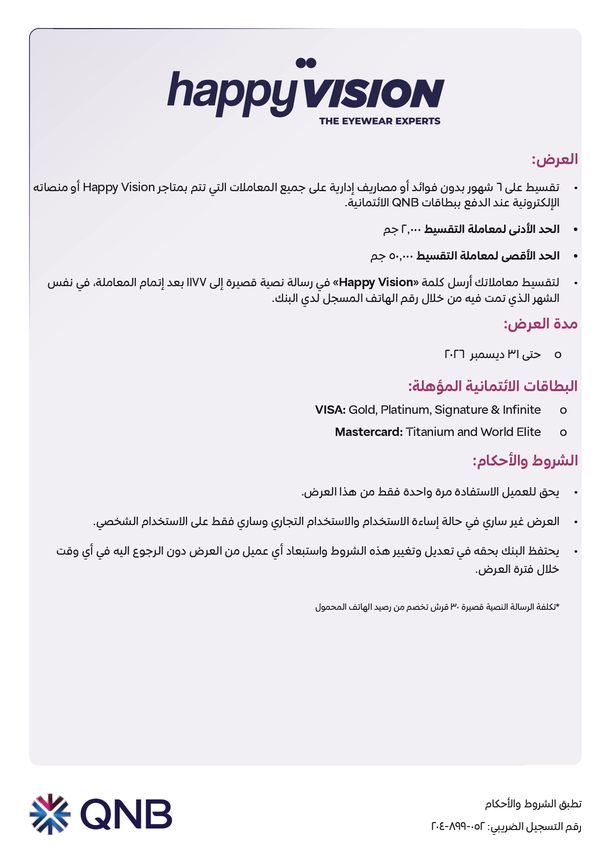 ويتيح البنك للعملاء تقسيط أحدث النظارات حتى 6 أشهر بدون فوائد من متاجر Happy Vision وذلك عند الدفع باستخدام بطاقات QNB الائتمانية.