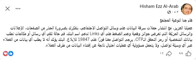 كما أكد عز العرب أن البنك لا يطلب أي بيانات من العملاء عبر أي وسيلة تواصل، ولا يتحمل مسئولية أي عمليات احتيال ناتجة عن إفشاء البيانات من طرف العملاء.