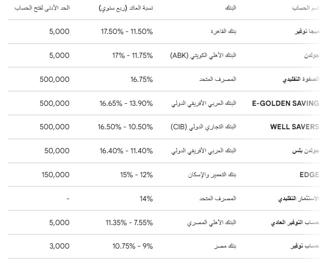 أما البنك الأهلي المصري فيقدم حساب التوفير بعائد يتراوح بين 11.35% و7.55%، مع حد أدنى يبدأ من 5000 جنيه، ما يجعله مناسبًا لصغار المدخرين.