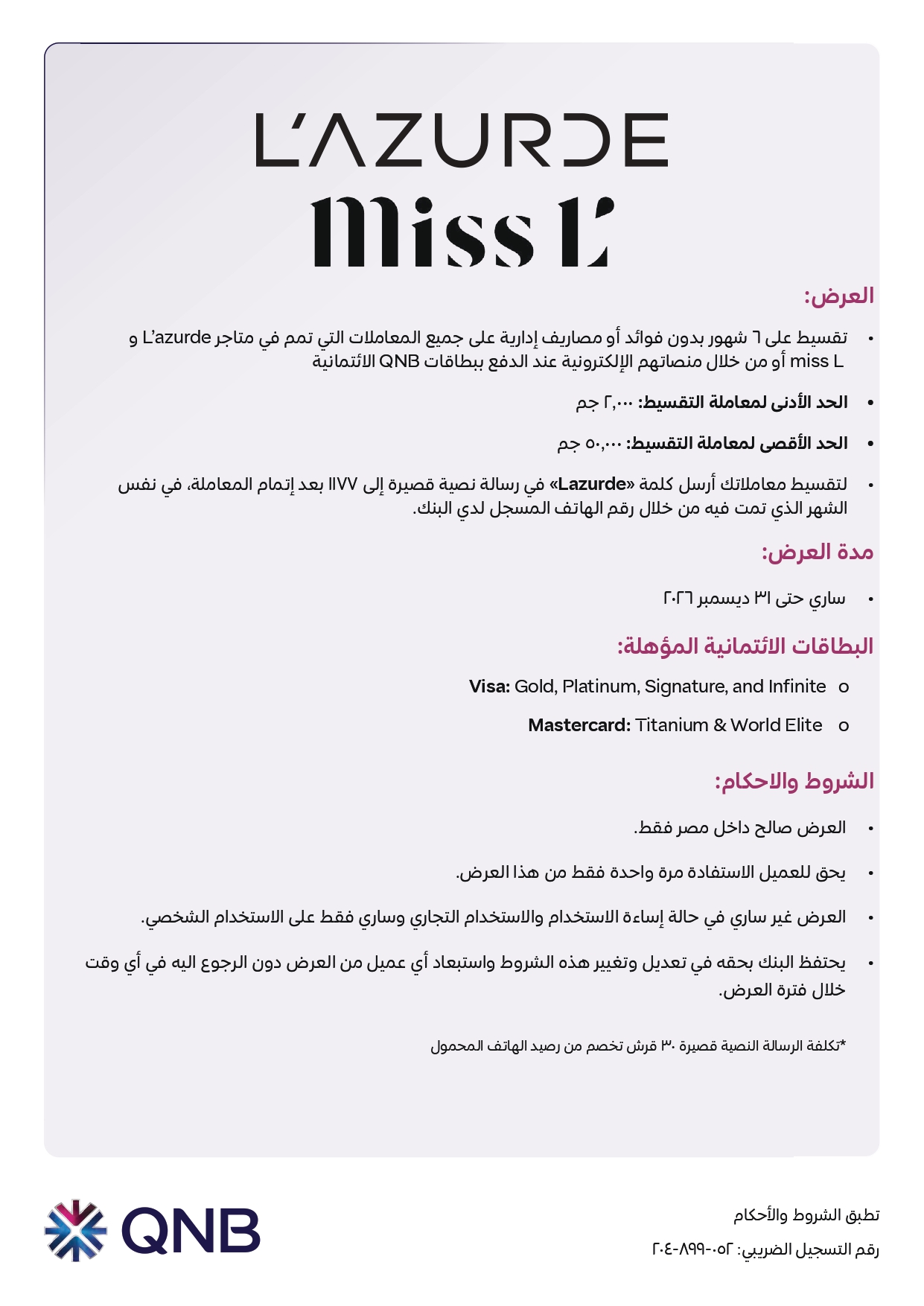 في عرض مميز لعشاق الأناقة والفخامة، يتيح بنك QNB مصر لعملائه فرصة اقتناء أجمل المجوهرات من فروع L’azurde and Miss L’، بالتقسيط على 6 أشهر بدون فوائد أو مصاريف إدارية.